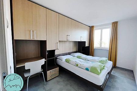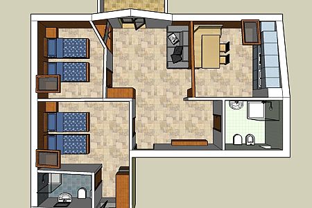 Composizione: cucina - soggiorno con divano, 2 camere (due letti singoli che si possono unire in ciascuna), bagno con doccia, balcone.