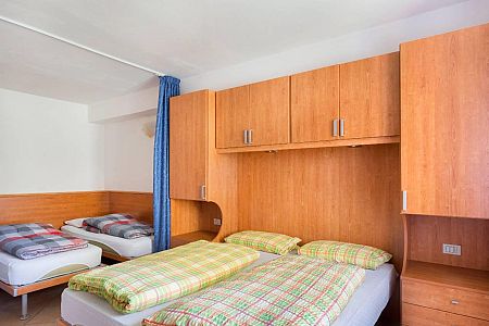 Composizione: cucina - soggiorno con divano, 2 camere (due letti singoli che si possono unire in ciascuna + un terzo letto), bagno con doccia, balcone.